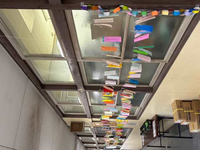 職員室前にそれぞれの願いが書かれた短冊がならびました。